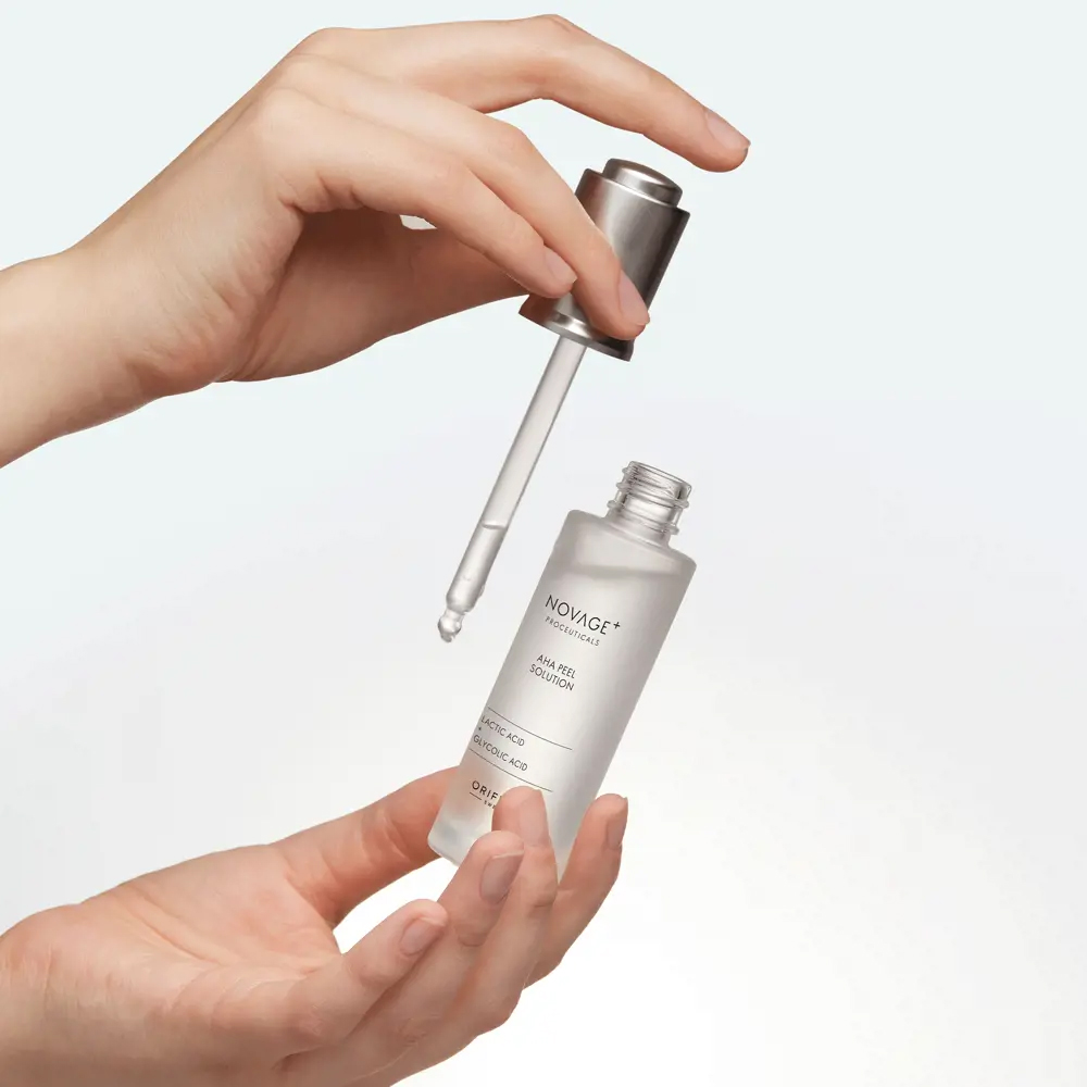 محلول لایهبردار نوویج+ پروسوتیکالز با ترکیبی از ۶٪ آلفا هیدروکسی اسید (۳٪ اسید گلیکولیک و ۳٪ اسید لاکتیک) و پانتنول تسکیندهنده، به بهبود نرمی و درخشندگی پوست کمک میکند.